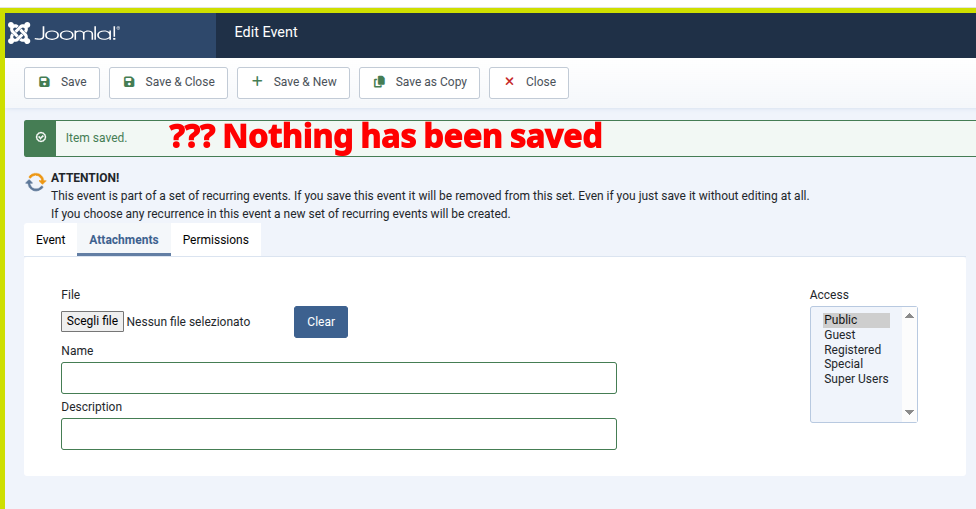 does it mean that the attachment is actually saved? Because even if it says "Item saved" the attachment is missing (see my pic #2).I can reproduce it, but I do not get any error.