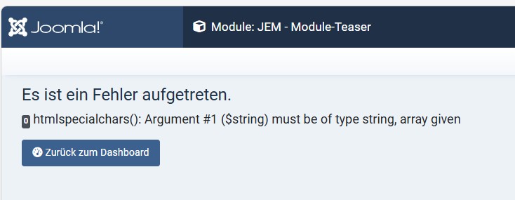 Im Modul mod_jem_teaser gibt es ein Feld für eine "countrylist". Das funktioniert nicht mehr und wird als Textfeld dargestellt. Ein Textfeld findet ein Array nicht gut, daher kommt die Fehlermeldung. Ich habe das Feld in der Datei mod_jem_teaser.xml erst mal auskommentiert. Damit läßt sich das Modul wieder pflegen.
