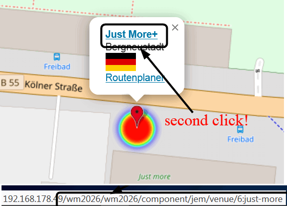 wenn ich in dem Modul "mod_jem_venues_map" auf den Event klicke, erscheint eine Fehlermeldung "Seite nicht gefunden" weil der Link der generiert wird 2x den Namen der "Seite" beinhaltet.