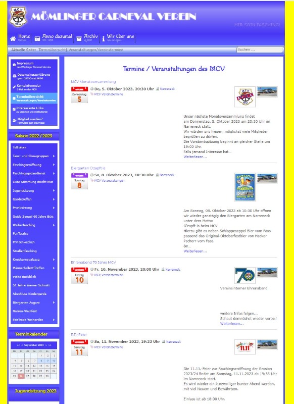 Wenn ich nun z.B. links im Menü "Terminübersicht" anwähle, sehe ich alle Veranstaltungen (Beitrag mit eingebettetem JEM - Modul Teaser).