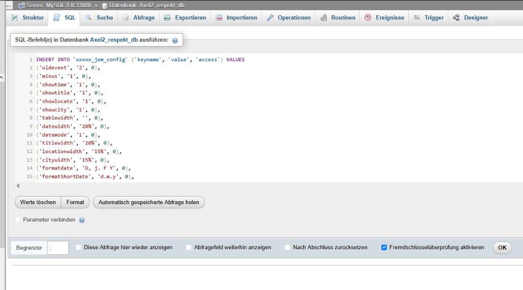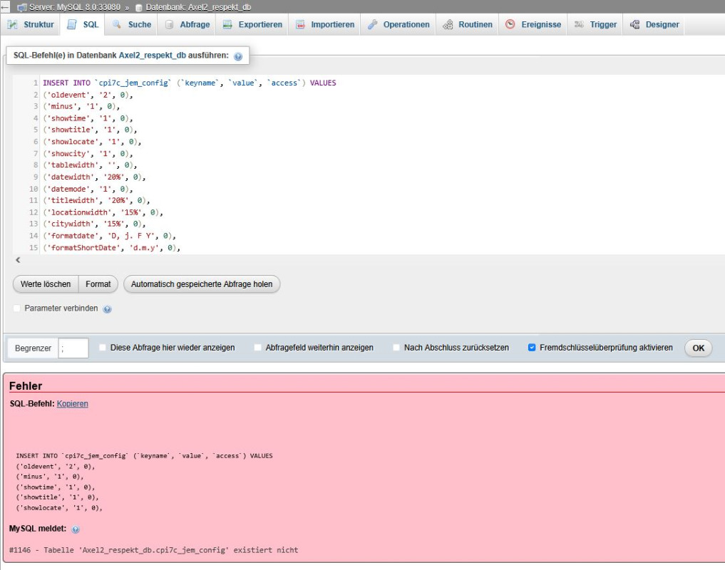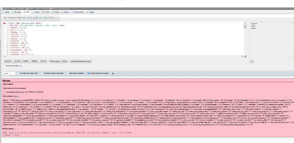 In your phpMyAdmin, scroll down to locate the cpj7c_jem_config table, then click 'Leeren' (Empty). Next, open the SQL tab, paste the content from the SQL file I shared earlier, and execute it (the name table must be the same, cpj7c_jem_config). This will populate the table with the default configuration values.