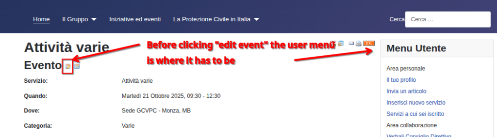 In the meantime I discovered what follows: by chance I logged in with an user who is Super-user, and when editing an event everything works just fine! I mean, the user menu remains on the right, where it has to be.