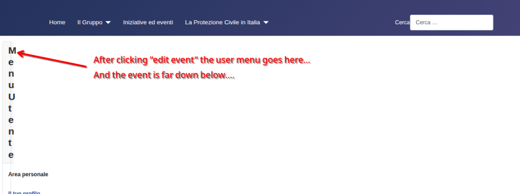 I'm facing a very strange behaviour when editing an event from the frontend: the User Menu, which usually appears on the right side, moves to the left, in an extremely narrow and vertical text, i. e. unreadable, pushing the event down below.